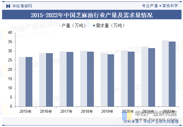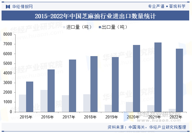 芝麻油具有奇特的风味且养分价值较高,是汗青长久的食用动物油品种之一,深受人们喜爱。数据显示,2015至2022年,我国芝麻油行业产量由26。93万吨增加至35。9万吨,期间复合年增加率为4。19%;我国芝麻油需求量由26。8万吨增加至35。27万吨,期间复合年增加率为4%。本文节选自华经财产研究院发布的《2023年中国芝麻油行业分类、产量、进出口商业及成长趋向阐发「图」》,如需获取全文内容,可进入华经谍报网搜刮查看。目前,我国芝麻油行业以出口为从,出口数量大于进口数量。按照中国海关总署数据,较2021年削减648吨,进口数量也有所削减,为310吨,较2021年削减404吨。