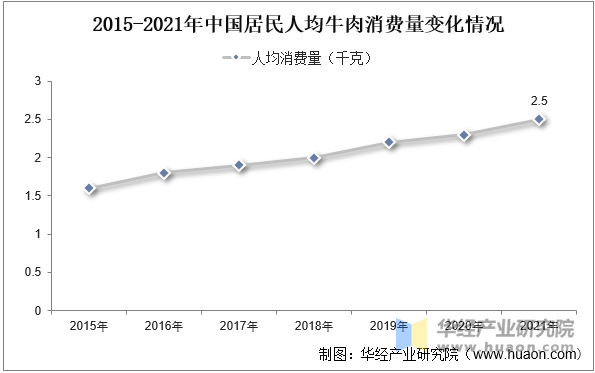 跟着人们的健康认识不竭提高,而牛肉因为其丰硕的氨基酸和卵白质而遭到越来越多人的青睐,从而导致需求量不竭添加。从牛肉人均需求量环境来看,近年来我国牛肉人均需求量稳步增加,由2015年的1。6千克/人增加至2021年的2。5千克/人。将来,跟着我国居平易近可安排收入的提拔,牛肉人均消费量将连结增加的态势,为牛肉行业的成长供给强劲动力。