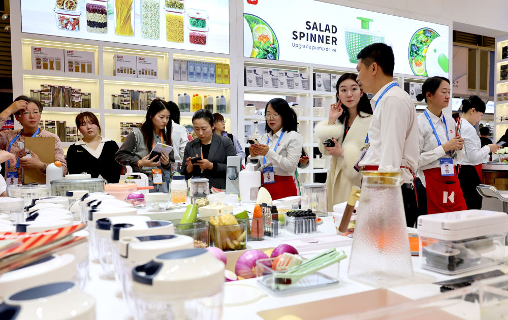 3月1日,第33届华东进出口商品买卖会正在上海揭幕。图为人们正在第33届华交会一处家庭用品展位交换。记者 方喆 摄。