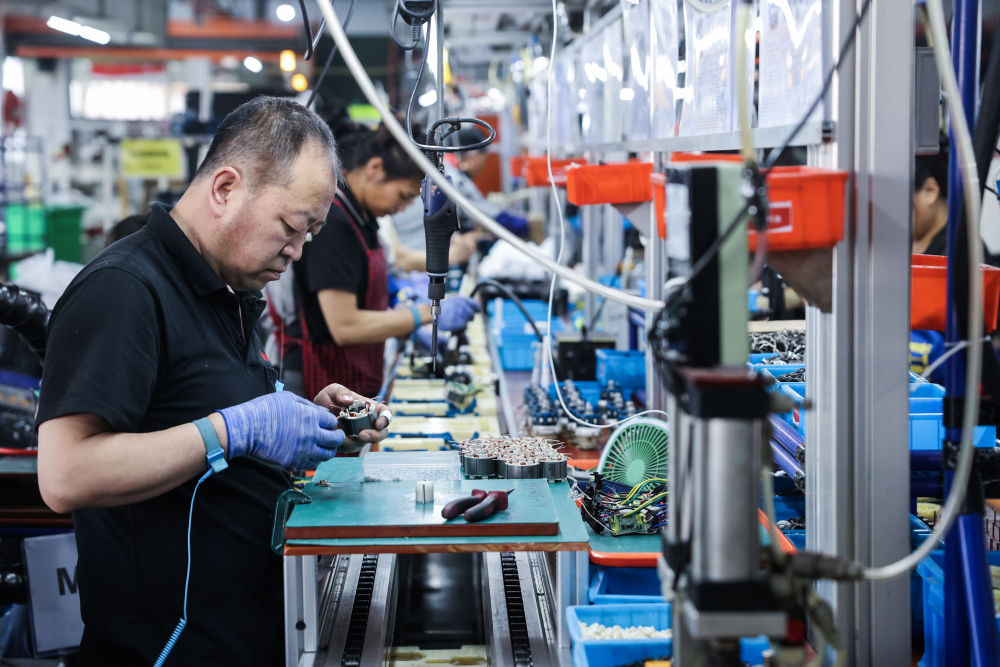 3月26日,正在位于嘉兴南湖区余新镇的浙江亚特电器股份无限公司出产车间,工做人员对出口的园林东西进行拆卸。记者 徐昱 摄。