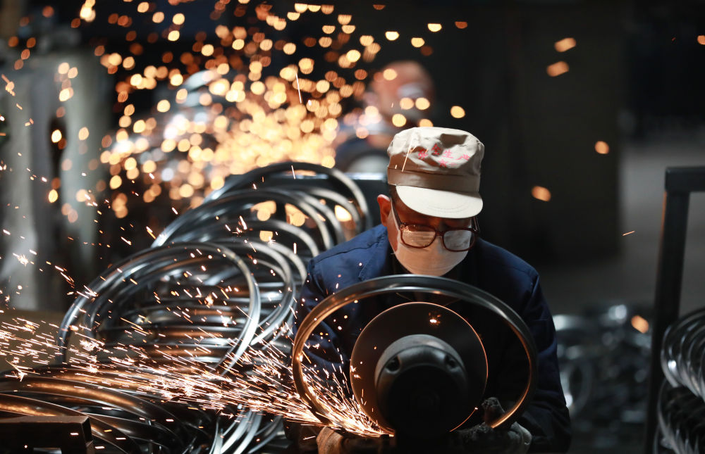 2月11日,正在浙江省杭州市临安区天目山镇一家外贸企业,工人正在对预备销往海外的自行车钢圈进行抛光功课。发(胡剑欢 摄)。