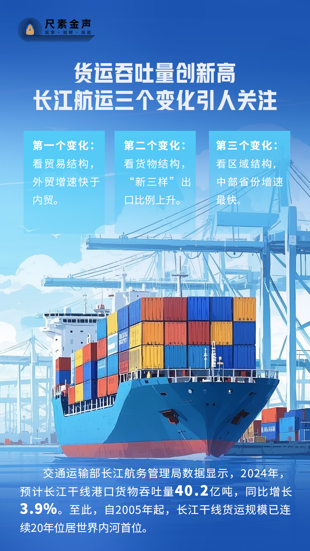 初次冲破40亿吨大关!交通运输部长江航务办理局数据显示,估计长江畔线年起,长江畔线年位居世河首位。新中国成立初期,长江畔线亿吨,仅用5年再次完成10亿吨新逾越连立异高的货运量,勾勒出一条更通顺、更聪慧、更绿色的现代化“黄金水道”,也透视出长江航运三个值得关心的变化。口岸,经济的“晴雨表”。放眼万里长江,一派忙碌气象:正在沉庆两江新区果园港,每以千计的新能源汽车从这里发往世界各地;正在姑苏港船埠,长江流域最大的汽车滚拆船埠投入运营,国产汽车出海再添新门户“黄金水道”百舸争流,交错成朝气蓬勃的成长图景。2024年前三季度,长江经济带货色进出口总额达14。61万亿元,同比增加3。8%。外需稳步扩大带动经济持续增加,客岁前三季度,长江经济带实现地域出产总值44。26万亿元,同比增加5。2%。经由愈加现代化的“黄金水道”,长江经济带11省市“多手连弹”,更好联通国内国际两个市场、用好两种资本,持续为中国经济稳中有进“供血充能”。2024年,长江沿线各省份不少“新三样”出产企业加速出产、出口增势优良不雅上逛,四川宜宾港增开到武汉水上快班和外贸集拆箱班轮,让更多“宜宾制”通江达海。2024年,宜宾市货色商业进出口350亿元,此中“新三样”外贸进出口总值超75亿元。瞰下逛,2024年全年,安徽芜湖港新能源汽车出口约2。1万尺度箱、同比增加31。5%,江苏南京港光伏等“新三样”产物出口近8。5万尺度箱,同比增加超30%。煤炭等大货色所占比例下降,制制业产物特别是“新三样”比例上升,过去一年,长江航运货色“一降一升”的可喜变化,成为中国出口布局持续优化的活泼缩影,也标注着中国制制业高端化、智能化、绿色化的成长程序。做为贯通工具、毗连南北、通江达海的水运大动脉,日益现代化的“黄金水道”,为“中国制制”扬帆出海塑制了更多新劣势。武汉阳逻国际口岸,客岁收支境船舶数初次“破百”,2024年前11月货色吞吐量同比增加22。1%;目光下移,江西港,铁水联运灵通全国27个地市,客岁前11月完成货色吞吐量达2亿吨2024年前11月,中部省份口岸货色吞吐量同比增加9。2%,增速大幅领先东部省份,成为长江航运的一抹亮色。货运量实现领跑,折射出区域经济向好势头。安徽抢占新能源汽车成长新赛道、湖北深耕光电子消息财产集群、湖南打制高端配备制制新高地抓住新时代鞭策中部地域兴起的主要成长机缘,中部省份加速以科技立异引领财产立异。坐正在更高起点,依托现代化的“黄金水道”,中部“脊梁”正在全国成长大局中的感化愈发较着。经济社会的成长,离不开大江大河的哺育。以水为纽带,长江毗连上下逛、摆布岸、干主流,承担着沿江经济社会成长所需80%以上铁矿石、电煤和外贸货色运输,每年对沿江经济社会成长的间接贡献超1200亿元,间接贡献达2万亿元以上。再立异高的货运规模、货轮如织的忙碌图景,涌动着中国经济的兴旺活力。