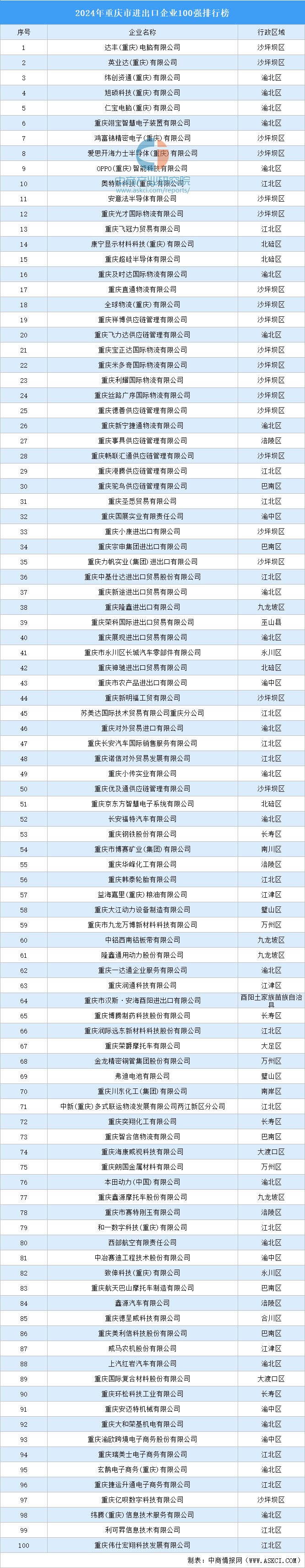 进出口企业100强企业中,渝北区、沙坪坝区各上榜企业100家企业,渝中区、巴南区各5家企业上榜。